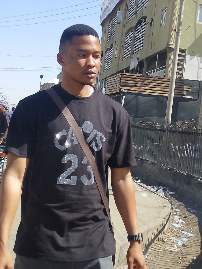 A young adult male of African descent, with a short, faded haircut and a slight mustache and goatee, stands on a paved surface in Sabon Gari West, Nigeria