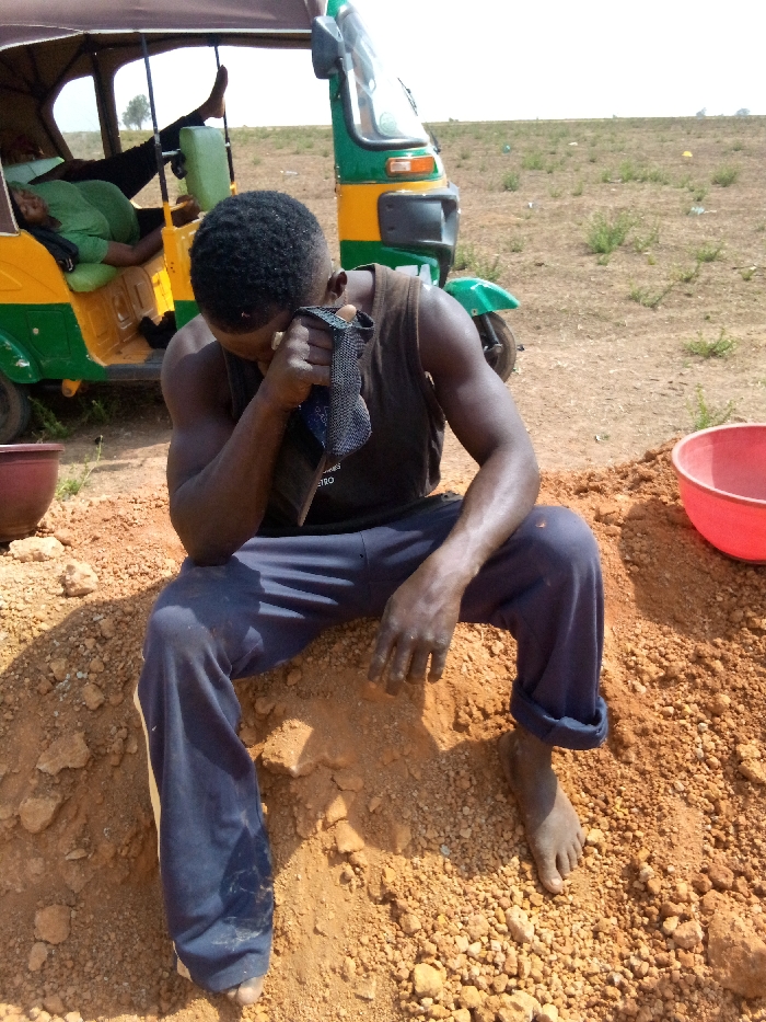 In South Ropp, Nigeria, an outdoor scene depicts an adult male with dark skin and short black hair, wearing a dark sleeveless top and dark blue trousers, seated barefoot on a mound of reddish-brown earth in the foreground