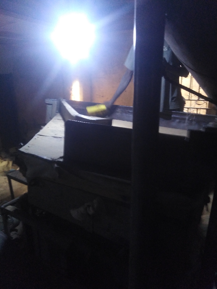 Inside a dimly lit space, an individual uses a yellow brush to clean a surface. The scene is back-lit by a bright light source, casting strong shadows. The surrounding environment contains what appears to be machinery or equipment, partially obscured by the darkness and a vertical support column. The person's arm is visible, clad in a light-colored shirt, as they manipulate the brush across the surface.