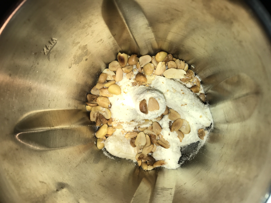 The image displays a top-down view inside a stainless steel blender container in Galadimawa, Nigeria. The interior surface of the container exhibits minor wear and reflections, with the word "MAX" embossed near the upper right rim. The container holds a mixture of three primary ingredients: numerous peeled, roasted peanuts, varying in light to medium brown coloration; substantial amounts of fine white powder, forming several mounds; and several elongated, light-colored pieces, consistent with sliced or broken banana, partially covered by the white powder and peanuts. The items are loosely settled at the bottom of the container, prepared for mechanical processing. No individuals or external environment are visible.