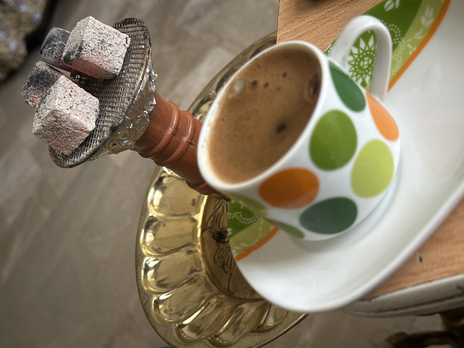 The image displays a close-up, overhead view of a coffee cup and a hookah head on a surface, likely indoors