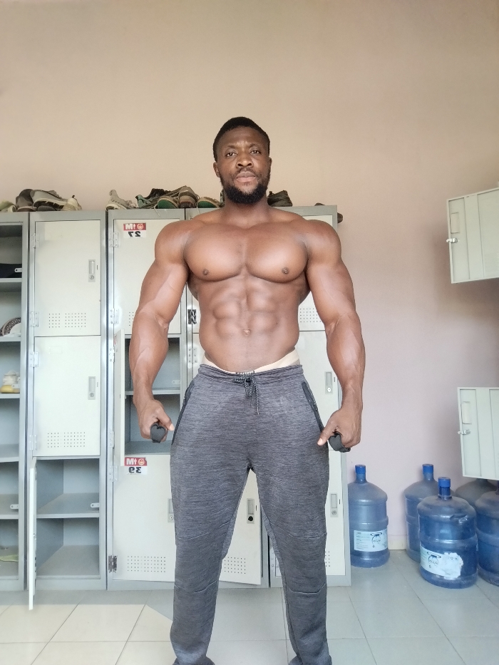 An adult male, exhibiting a muscular physique with visible abdominal definition, stands shirtless, wearing dark gray athletic sweatpants, in an indoor setting located in Unguwar Rimi, Nigeria