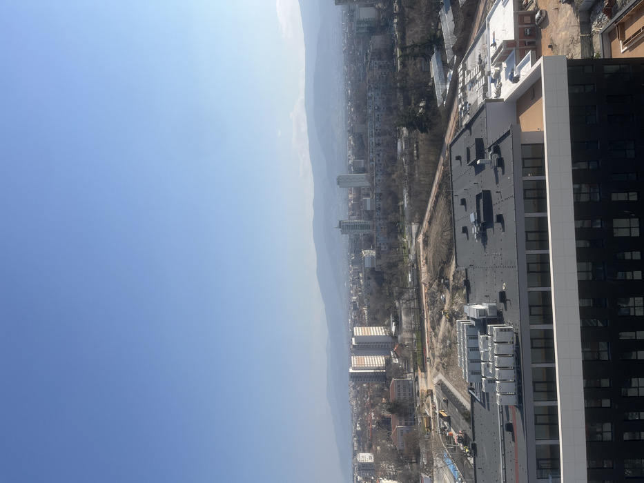 An elevated, wide-angle daytime photograph captures a panoramic view of the city of Plovdiv, Bulgaria, under a clear, light blue sky. In the immediate foreground, the flat, dark grey roof of a large, modern building occupies the lower portion of the frame. This roof features multiple rows of rectangular HVAC units and various ventilation components. Below the roofline, the upper stories of this building display a dark, reflective facade with numerous evenly spaced rectangular windows, capped by a prominent white horizontal architectural band. Adjacent to the foreground building, to the left, an active construction site is visible. This site encompasses areas of disturbed brown earth, several pieces of heavy construction machinery (appearing as yellow-toned excavators or bulldozers), and a newly paved section of dark grey road. Multiple human figures, consistent with construction workers, are present on this site, though individual details are obscured by distance. To the right of the foreground building's main roof, a lighter-colored rooftop structure is visible, where pallets of white building blocks and other construction materials are staged. The midground reveals a dense urban environment comprised of various multi-story buildings, including several tall residential or commercial towers. Two distinct tall, white, slender buildings are prominent in the central midground, alongside a pair of larger, multi-windowed white structures to the left. Numerous other buildings of varying heights and architectural styles populate the urban grid. Patches of bare, deciduous trees are visible throughout the city, suggesting a non-foliage season. The background features a long range of hazy, bluish mountains spanning the entire horizon, under the clear sky. No specific people, subjects, actions, or interactions are discernible in detail beyond the general presence of construction workers and the urban environment itself.