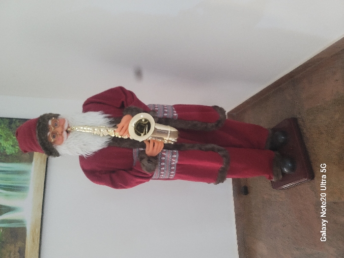 This image, captured in Gura Top, Nigeria, displays a standing, life-sized decorative figure resembling Santa Claus, positioned indoors. The figure wears a red suit with dark brown fur trim along the collar, cuffs, and hem, and a matching red pointed hat with fur trim. A patterned band featuring a geometric design in shades of white, grey, and light blue adorns the suit's midsection and lower sleeves. The figure has a prominent white beard and mustache, and wears round, gold-rimmed spectacles. It holds a gold-colored alto saxophone with white keypads in both hands, positioned as if playing. The figure stands on a dark brown, rectangular wooden base. The background consists of a plain white wall. A framed landscape photograph or painting, depicting a waterfall with green foliage, hangs on the wall behind the figure's upper body. The floor is a light brown, possibly tiled or concrete, meeting the wall at a dark brown baseboard. A small, dark, unidentifiable object is visible on the floor to the left of the figure's base. The bottom left corner of the image bears a "Galaxy Note20 Ultra 5G" watermark.