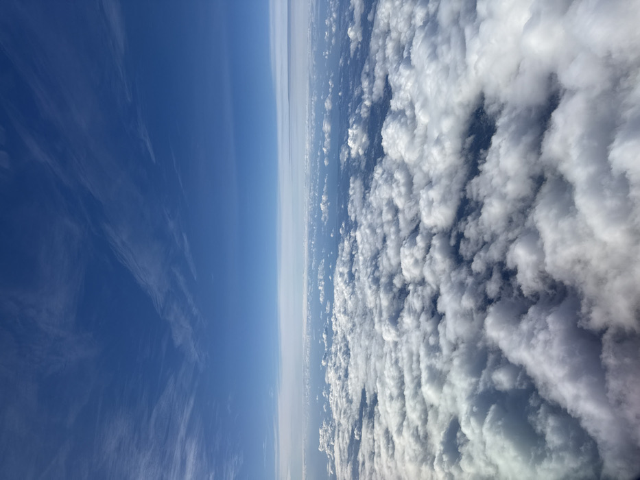 The image displays an aerial view over the region of Moreira, Portugal. The scene is bisected horizontally by a distant horizon line. The upper portion, approximately one-third of the frame, features a deep blue sky with subtle, wispy cirrus clouds. Below the horizon, a transitional layer of lighter blue sky and thin, hazy clouds is visible. The lower two-thirds of the image are dominated by a dense, irregular blanket of white, puffy cumulus clouds, exhibiting natural shadows and variations in depth. Scattered breaks within the cloud cover reveal fragmented glimpses of the underlying terrain, which appears to be a mix of land and possibly water in the far distance. No individuals, specific man-made objects, or discernible actions are present in the frame, depicting a natural landscape from a high altitude.