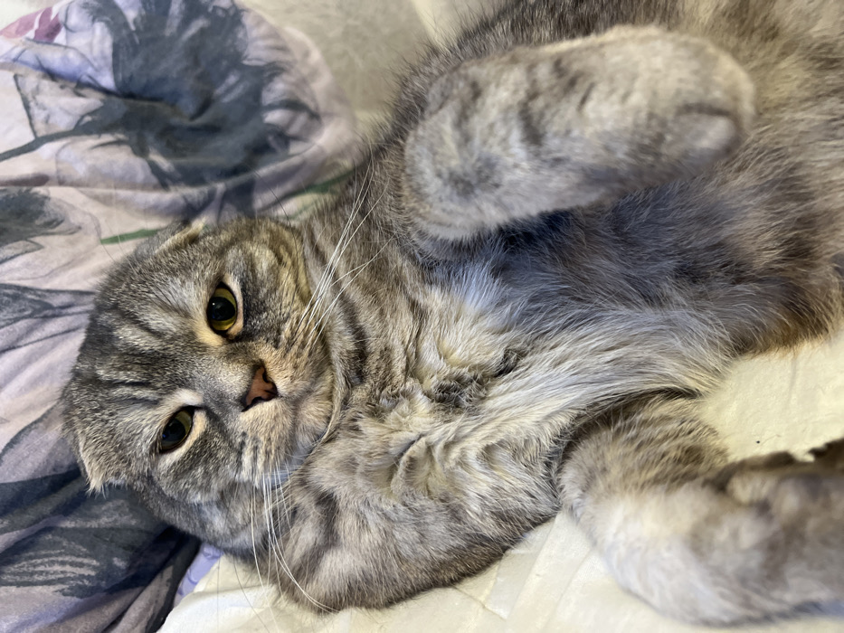- "This image depicts a grey tabby cat, consistent with a Scottish Fold breed due to its folded ears and facial structure, lying on its back or side" by FM-6LnVy2, licensed under CC BY 4.0