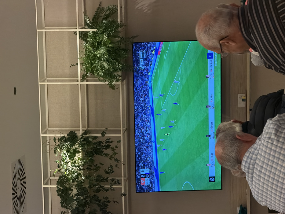 This image depicts an indoor public establishment, likely a bar or restaurant, located within the city of Gandia, Spain. The specific name or address of the venue is not discernible. The scene focuses on a large, wall-mounted flat-screen television displaying a soccer (football) match. The score is 0-1, with a game clock showing 45:54. Visible on the screen are players in light blue and dark blue kits on a green pitch. Text on the television includes "TV BAR DIRECTO," "Emirates" (sponsor), player names "TRENT," "22 RÜDIGER," "ALABA," and "CARVAJAL" (partially obscured), and the Real Madrid logo with the hashtag "#RealMadrid." In the foreground, the backs of three adult males are visible, seated and facing the television. The leftmost individual has short grey hair and wears a light-colored plaid shirt. The central figure's head and shoulders are visible, wearing a dark jacket or shirt. The rightmost individual has short grey hair, wears eyeglasses, and a dark-striped shirt. No direct interaction between these individuals is observable. Above the television, a decorative structure of white rectangular frames is mounted on a textured beige wall. This structure holds and supports two sections of green plants: vining foliage on the left and ferns on the right. The ceiling is light-colored and features a circular air vent with a spiral pattern on the left and a small recessed light fixture towards the center. A light-colored ledge or counter runs horizontally below the television. The lighting in the room is ambient.