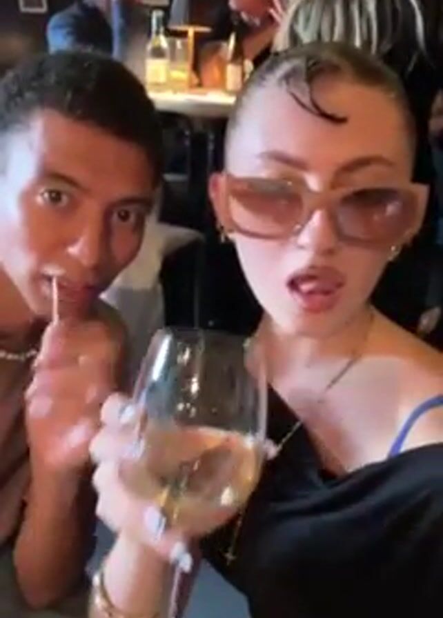 A light-skinned woman in sunglasses is drinking from a wine glass while a light-skinned man with a toothpick in his mouth leans in. The woman has light brown hair in a tight bun, gold jewelry, and is wearing a black top. The man has short dark hair. They are in a dimly lit indoor setting, likely a restaurant or bar, with other people visible in the background. The background has black and white photos on the wall. The camera is handheld and close to the subjects. The woman kisses at the camera.