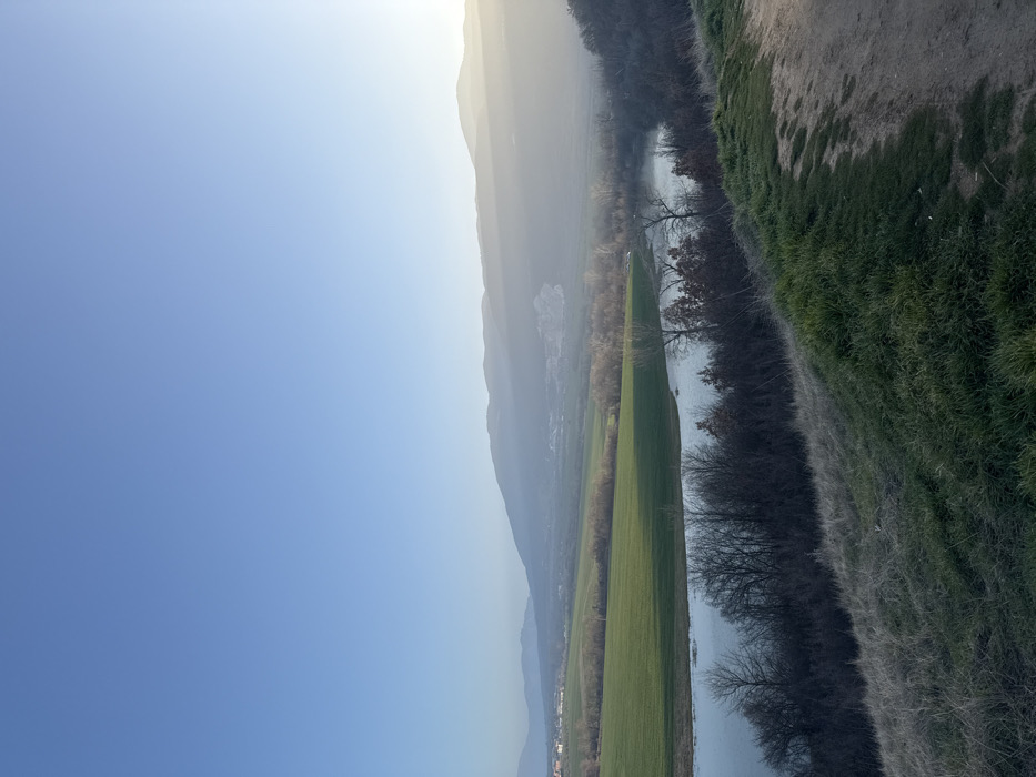 The image displays a panoramic landscape view identified as Muldava, Bulgaria, under a clear blue sky. In the immediate foreground on the right, a dirt path ascends a slope covered with dry, light brown grass interspersed with patches of vibrant green grass. The middle ground features a light blue-grey river flowing horizontally across the frame, its banks lined with numerous bare deciduous trees. Beyond the river, expansive green agricultural fields stretch towards the base of distant mountains. In the background, multiple layers of hazy hills and mountains are visible, culminating in the horizon. A small cluster of buildings with reddish roofs is discernible on the far left in the distance, while a prominent light-colored, possibly quarry or industrial, site is located on a distant hillside in the central background. The sky, a clear blue overhead, transitions to a lighter, almost white hue towards the right, indicating the position of a low sun and contributing to the atmospheric haze observed over the mountains. No individuals, animals, or discernible actions are present in the static scene.