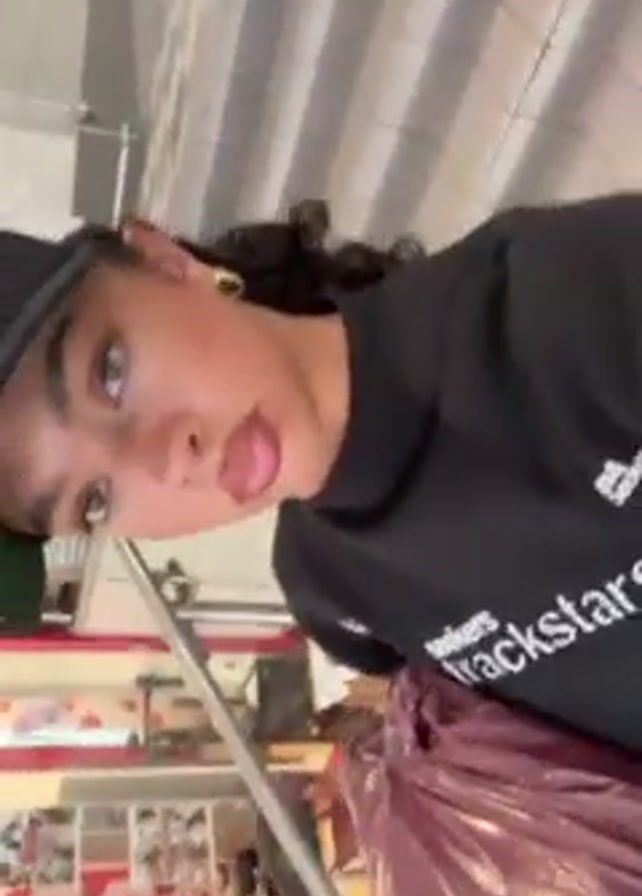 A person is holding a camera looking up at their face, wearing a black baseball cap with a green bill, gold hoop earrings, and a black long-sleeved shirt with "Seekers trackstar" printed on it. They are looking directly at the camera with a slight pout. They are holding a large, maroon plastic bag in front of them. In the background, there is a rack of items, including what appears to be a magazine and some greenery. The floor has a gray and white striped pattern.