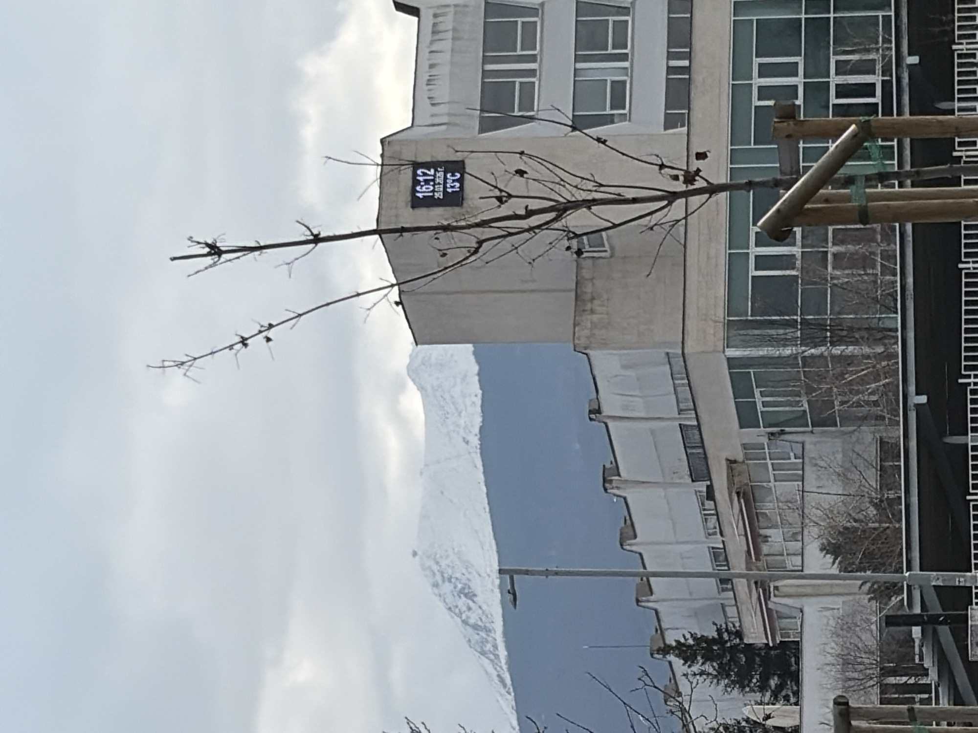 The image displays an urban scene in Sofia, Bulgaria, under an overcast sky. In the background, a prominent snow-capped mountain range, consistent with Vitosha, is visible. The midground features a multi-story, light-colored building on the right, which hosts a black digital display showing "16:12", "25.03.2020 г.", and "13°C". This building has multiple windows and a weathered facade. To its left, a lower, lighter-colored building with numerous windows is partially obscured by a grey streetlamp. Evergreen trees are discernible behind the lower building. The foreground contains several bare deciduous trees or saplings, one of which on the right is supported by a three-post wooden structure. A white fence is present at the very bottom of the frame. No individuals or specific actions are observed.