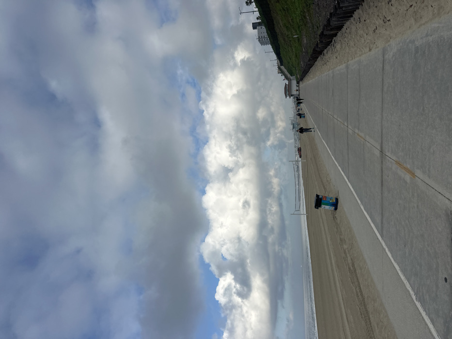 A beach scene features a paved boardwalk stretching into the distance. To the right, grass slopes down towards the sand. Several distant figures walk along the boardwalk. A colorful trash can sits on the edge of the path. Beyond the beach lies the ocean, and the sky is filled with dynamic clouds, some dark and others bright white. The image is rotated.