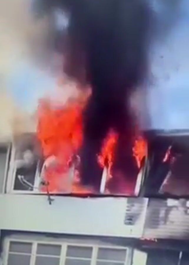 two-story building engulfed in flames. The fire is concentrated on the upper floor, with large orange flames visible through the windows and black smoke billowing upwards. The lower floor has windows, but no fire is visible there. The building appears to be white or light-colored. The footage is shaky.