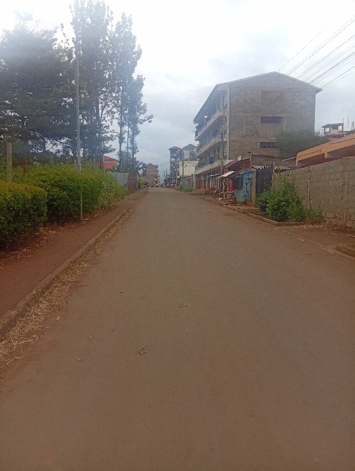 A street stretches ahead under a cloudy sky. Buildings line the right side, including a large, grey apartment block. A stone wall borders the street further down. Lush green bushes and trees are on the left. The road surface is cracked, with debris scattered on it. People gather in the distance at the end of the street. Overhead, a tangle of wires cuts across the sky.