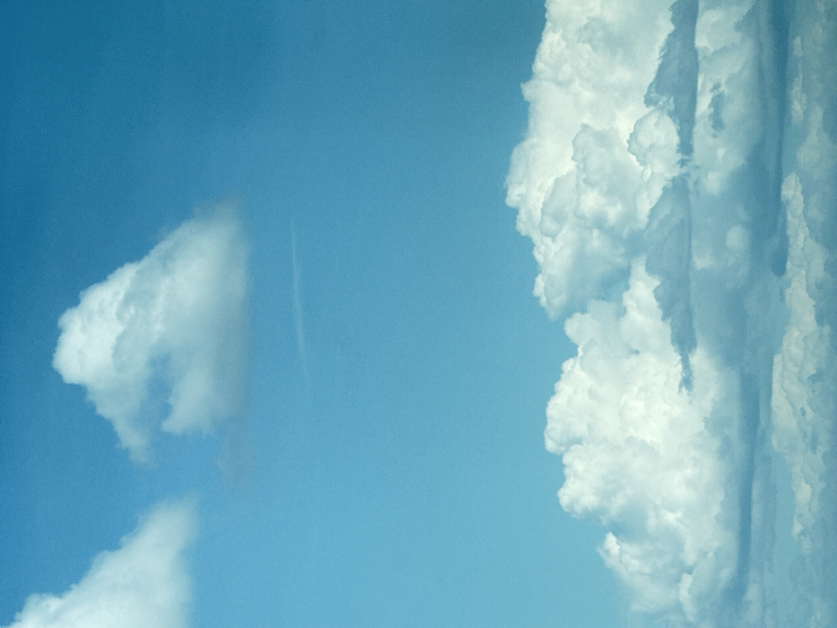 This image displays a sky scene over Puebla City, Mexico. The upper two-thirds of the frame consist of a clear, light blue sky. In the upper left quadrant, a portion of a diffuse white cloud is visible. A distinct, isolated white cumulus cloud, generally triangular in form, occupies the upper central area. The lower third of the image is filled with a dense band of cumulus and stratocumulus cloud formations, exhibiting variations in color from bright white to shades of light grey and blue, indicating depth. No human figures, animals, structures, or identifiable ground objects are present within the frame.