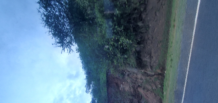 A roadside view with a clear blue sky above. A dense, dark green tree stands to the left, while the adjacent land slopes down to a rocky embankment covered in low-lying vegetation. To the right, a paved road with a white dividing line cuts into the frame. The image is captured at an angle, giving a tilted perspective.