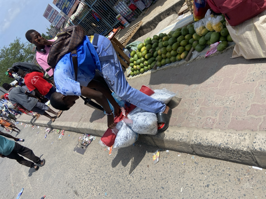 This image depicts an outdoor street scene within the Kigamboni District of Dar es Salaam, Tanzania, as indicated by a prominent blue real estate sign in the background. The time is daytime, characterized by bright sunlight and distinct shadows. In the foreground, a young adult male, likely a vendor, is seated on a low wooden stool or crate. He is wearing a light blue short-sleeved patterned shirt, light blue jeans with anchor-themed embroidery, a blue fanny pack, and black slides with red accents. A brown patterned backpack is slung over his right shoulder. He is actively engaged in handling merchandise, specifically several white patterned cushions or pillows individually wrapped in clear plastic bags, and some red fabric items. These goods are piled on the ground next to him. Adjacent to the vendor, on a reddish-brown patterned paved sidewalk, a large quantity of green, unripe mangoes is displayed on a mat or tarp. Further to the right, some yellow mangoes in plastic bags and a red backpack are partially visible. The paved sidewalk is elevated from a grey asphalt road by a concrete curb. Along the edge of the road, near the curb, scattered litter including plastic wrappers and paper is visible. In the mid-ground and background, several other individuals are present. One person in a teal shirt and dark pants walks along the asphalt road. Another individual in a pink t-shirt with headphones around their neck stands near the central vendor. Further down the sidewalk, another person in a red t-shirt is partially visible. The background reveals structures resembling market stalls or shops, with the aforementioned blue sign advertising real estate for rent in "Kigamboni" prominently displayed.