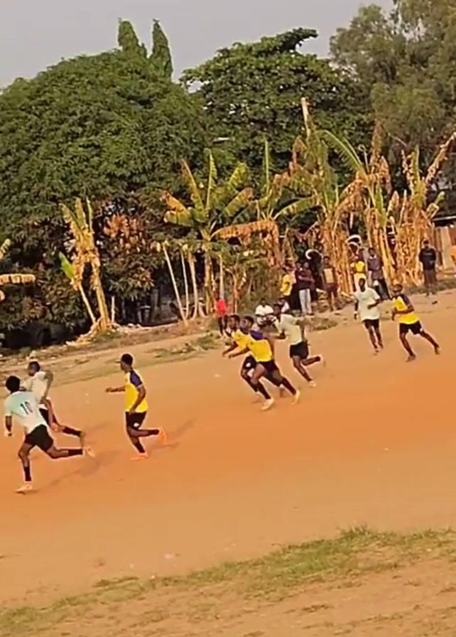 group of young men playing soccer on a dirt field. Most of the players are wearing yellow and blue jerseys, while others are wearing white jerseys with black shorts. They are actively running and kicking the ball towards a goal, which is marked by a simple frame without a net. The environment appears to be somewhat undeveloped, with a backdrop of banana trees, buildings, and a billboard. Several people are watching the game from the sidelines. The camera follows the action of the game, focusing on the players and their movements on the field.