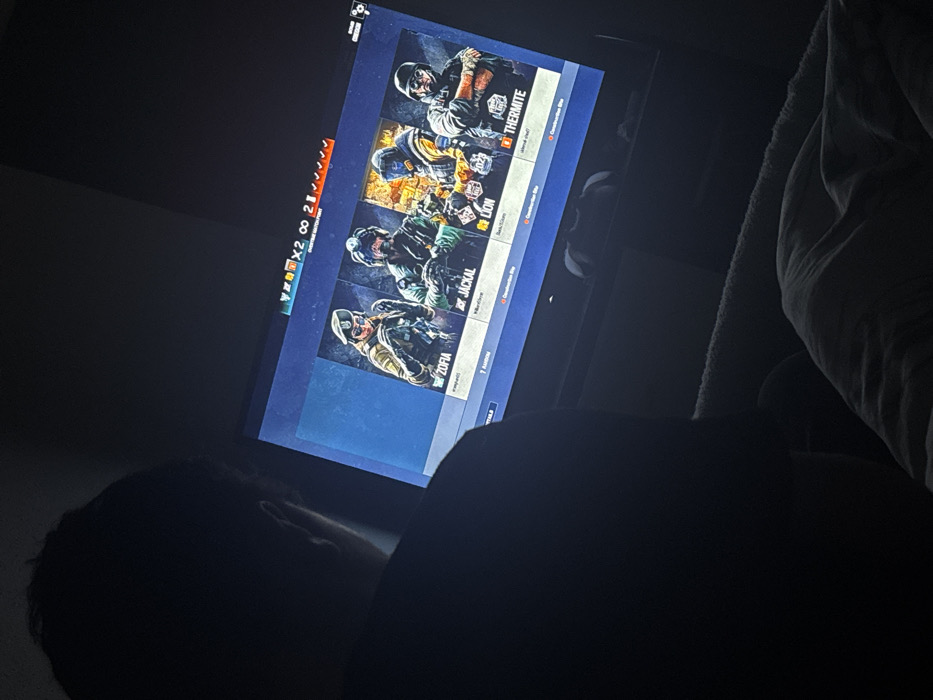 An individual is depicted from behind, their head and upper torso silhouetted against a brightly illuminated television screen in a dimly lit indoor environment, located in Welshpool, United Kingdom. The television displays the character selection interface of the video game "Rainbow Six Siege." Four operator characters are prominently featured: Zofia, Jackal, Lion, and Thermite, each with a corresponding player username below them, specifically "xrmpvp05," "MikeClover," "Bock-Ticket," and "almvd xhxf" respectively. The game's user interface at the top of the screen shows score indicators (e.g., "2-1"), a "x2" multiplier symbol, and various connection/ping icons. A white video game controller, consistent with an Xbox design, rests on a dark surface directly below the television. A light-colored, soft textile, possibly a blanket or throw, is visible in the lower right foreground, suggesting the individual is seated on a soft furnishing. The primary light source in the scene is the television screen itself.