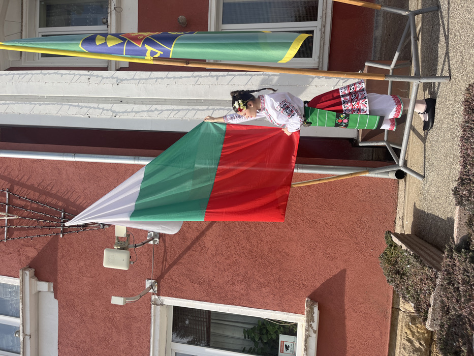 A full-frame, eye-level outdoor photograph captures a young female in traditional Bulgarian attire, standing on a paved surface in front of a reddish-brown stucco building in Dve Mogili, Bulgaria. She is positioned slightly right of center, facing left in profile, with her right arm extended upwards, holding the white, green, and red horizontal stripes of a large Bulgarian flag. Her left arm is bent at the elbow, hand near her waist. She wears a white blouse with intricate colorful embroidery on the sleeves and chest, a green apron over a red and white patterned skirt, white tights, and black Mary Jane-style shoes. Her dark hair is styled in braids with white and red floral adornments. To her right, a second flag, primarily green with yellow accents and a blue emblem featuring three yellow atomic symbols, is visible on a wooden pole. Both flags are supported by a gray metal stand on the ground. The building behind her features two white-framed windows; one on the left has horizontal blinds and a visible security camera sticker. Above this window, two white wireless communication units are mounted on the wall. A grey downspout runs vertically along the building's facade to the right of the Bulgarian flag. Decorative string lights with bare bulbs are strung vertically down the building. The ground level includes a concrete planter box with low-lying green and reddish foliage. Sunlight illuminates the scene from the right, casting shadows on the building and ground.
