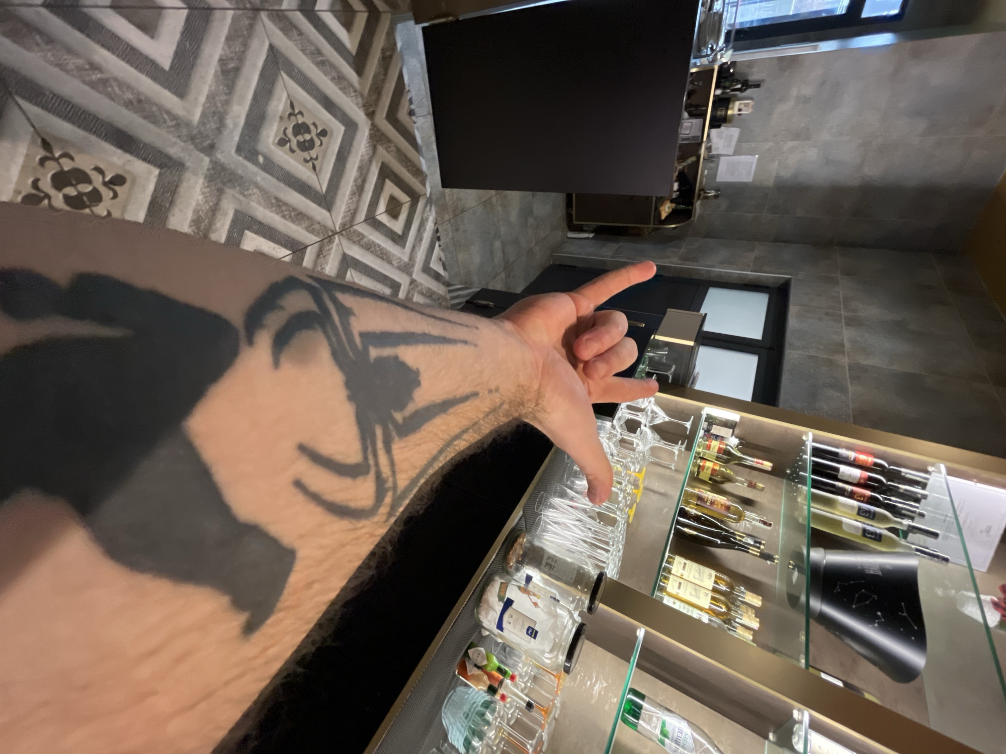 The scene appears to be inside a bar or restaurant in Shumen, Bulgaria. The floor has patterned tiles in shades of gray, beige, and white. Above, there is a black-colored item, possibly a TV screen, mounted on the wall. A man's arm with a large tattoo is visible on the left side of the image, with his hand pointing towards the center. To the right, there is a glass-fronted display case containing glassware and an assortment of bottled wines, with a black bottle cooler.