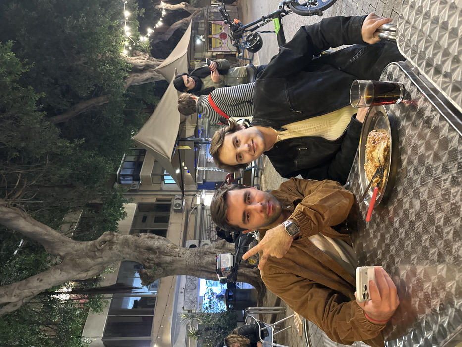 Two men sit at a metal table outdoors, one holding a phone and giving the peace sign, the other looking at the camera. A glass of dark liquid and a plate with food are on the table. Other people are seated nearby, and a parked scooter is visible. Trees and buildings with lights are in the background. The photo appears to have been rotated counterclockwise.