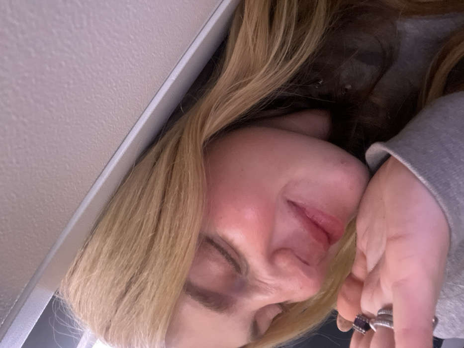 The image presents a close-up, angled view of an individual in an indoor setting, located in Pudong, China. The person has long, wavy blonde hair and is captured with their eyes closed, a slight smile on their lips, and a noticeable flush on their right cheek. Their head is tilted, and the right hand is brought up close to the face, with the palm facing slightly upwards. The right index finger displays a rectangular dark purple stone ring, while the ring finger wears two silver-colored band rings, one plain and one textured. A portion of a grey long-sleeved garment is visible on the right arm and shoulder. The background is a plain, light-colored, textured surface, possibly a wall or ceiling, with a narrow, light-colored trim element running diagonally across the upper section.