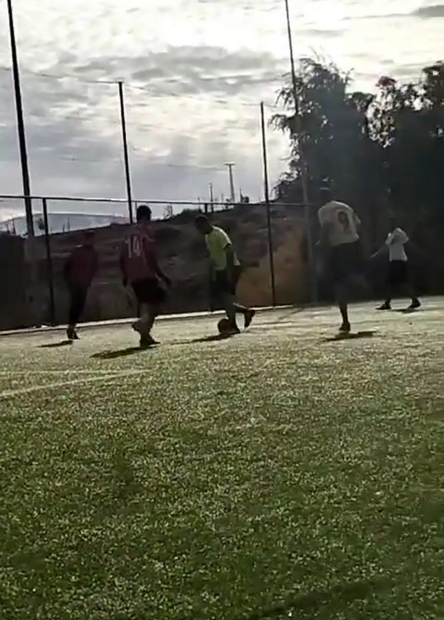 On a soccer field with artificial turf, four men are playing soccer. They are wearing casual athletic clothes, including one in bright yellow. There is a black net surrounding the field, and in the background are some houses and a hillside. The sky is cloudy, and a lone soccer ball is visible.