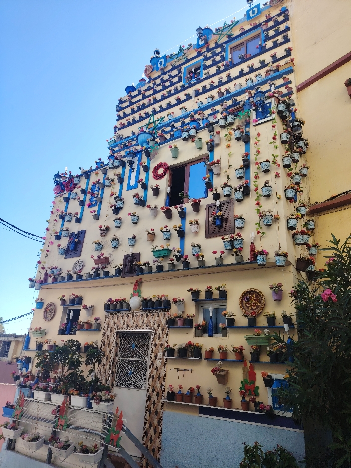 The image depicts a five-story residential building located within the Kasbah of Tangier, Morocco, distinguished by its extensively decorated facade