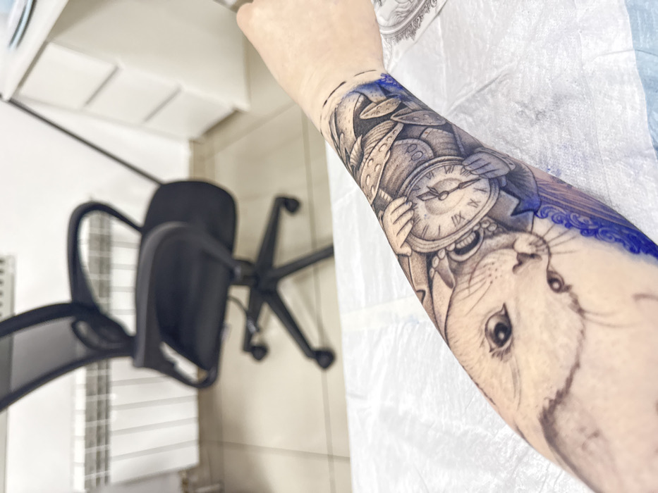 The image displays a human forearm in an indoor setting, identified as Rostov-on-Don, Russia. The forearm is positioned centrally on a white surface covered by a blue disposable sheet. A partially completed tattoo in black and grey ink covers a significant portion of the arm. The tattoo depicts a detailed rabbit-like head, oriented inversely, with whiskers and a visible eye, positioned beneath a robed figure's hands holding a pocket watch with Roman numerals. Blue stencil residue is evident along the peripheral edges of the tattoo, indicating unfinished sections of the design. The background is out of focus, revealing a black ergonomic office chair with a mesh back and five-wheeled base. Behind the chair, a white horizontally-finned radiator is mounted on a plain white wall. A segment of a white three-drawer cabinet is partially visible on the right side of the frame. The floor consists of light-toned square tiles. The environment suggests a professional and sterile workspace, consistent with a tattoo studio.