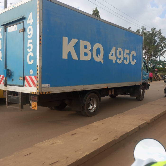 The image captures a light blue box truck, license plate KBQ 495C, positioned on a road in Kakamega, Kenya