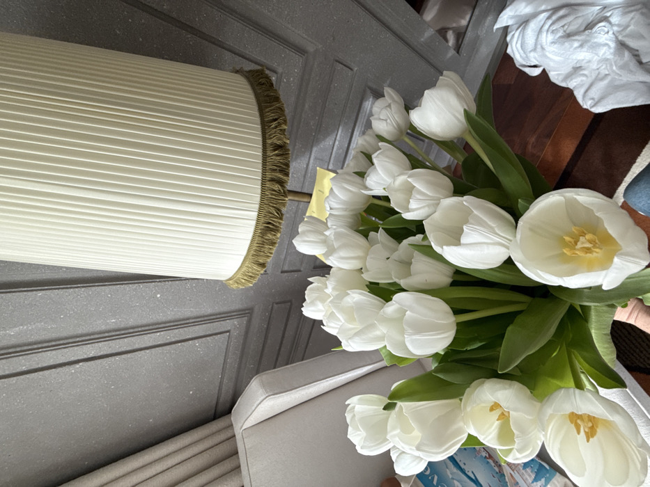 The image displays an indoor scene dominated by a large bouquet of fresh white tulips with green stems and leaves, held by a person's hand partially visible at the bottom center. Several tulips are in various stages of bloom, with some showing yellow stamens. The tulips rest on a dark wooden surface, likely a table. To the left of the bouquet, a segment of a light beige upholstered armchair is visible. In the background, a grey wall features classical panel molding. A cream-colored pleated floor lamp shade with a dark green fringed trim descends from the upper right, partially obscuring the wall and a yellow sticky note attached to the lamp stand. A light-colored curtain is visible on the far left. Crumpled white fabric is seen on the wooden surface to the right of the tulips. The specific location within the city of Bordeaux, France, cannot be determined from the visual information present in the image.