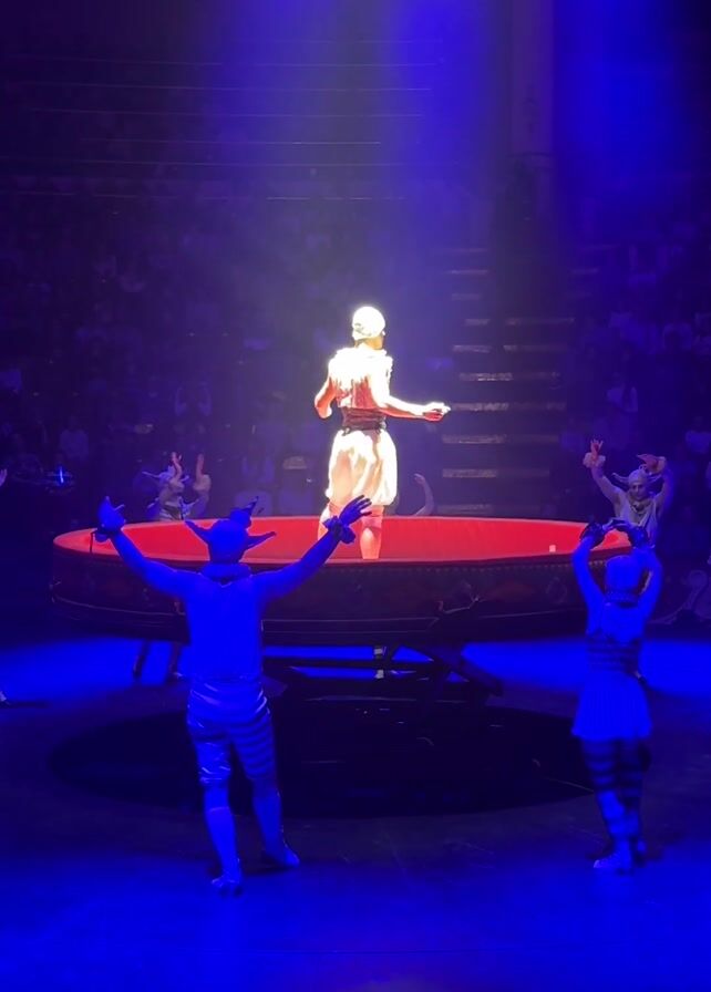 A person stands in a large red bowl-shaped structure on a stage, illuminated by a bright white spotlight. They are wearing a white outfit with a short skirt. Several other performers dressed in blue and white striped costumes with pointed ears and tails surround the bowl, their arms raised. The stage is dark blue, and an audience is visible in the background, partially obscured by shadows. Overhead, blue lights create a dramatic atmosphere. The red bowl is elevated on a stand. The performers surrounding the bowl appear to be moving or dancing.