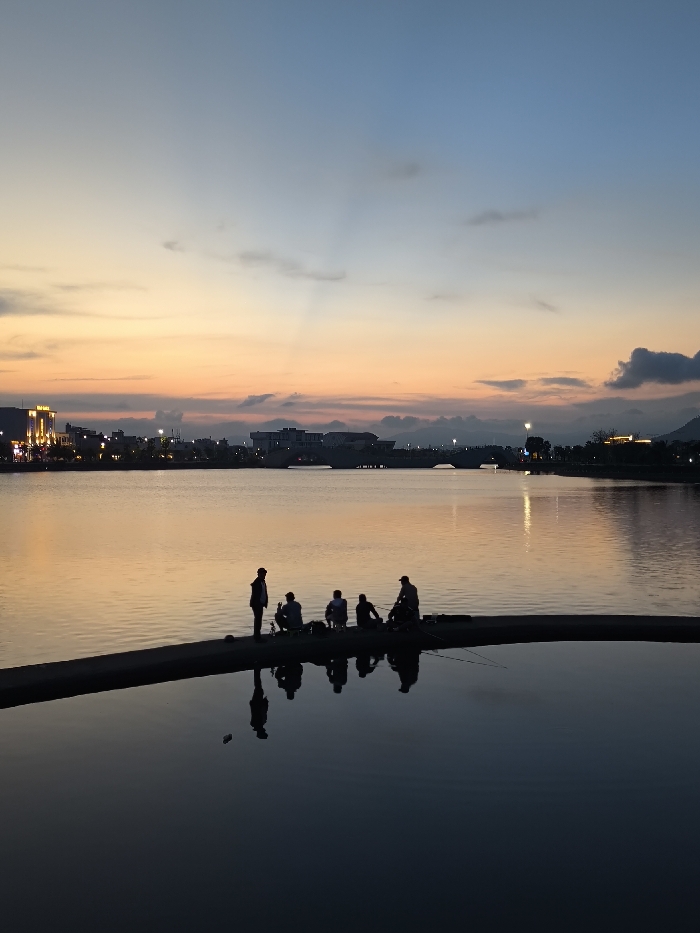 This image depicts a tranquil waterfront scene in Tuy Hòa, Vietnam, observed during sunset or twilight. The sky transitions from light blue at the zenith to warm orange and yellow hues at the horizon, with scattered dark clouds and subtle crepuscular rays extending upwards from the left. In the foreground, a group of five individuals is silhouetted against the calm waters of a large river or lake. They are positioned on a low, narrow concrete or paved embankment extending into the water. One person stands on the far left, while four others are seated to their right. At least two fishing rods are visible, extending into the water from the seated individuals, indicating an activity of fishing. Their dark reflections are distinctly mirrored in the water directly beneath them. Across the body of water, the illuminated skyline of Tuy Hòa is visible. Numerous city lights are active along the distant bank, and a multi-arched bridge spans the water in the mid-distance. A prominent multi-story building with bright yellow illumination is visible on the far left bank. Distant hills or mountains form dark silhouettes against the horizon on the right side. The water reflects the warm colors of the sky and the distant city lights.