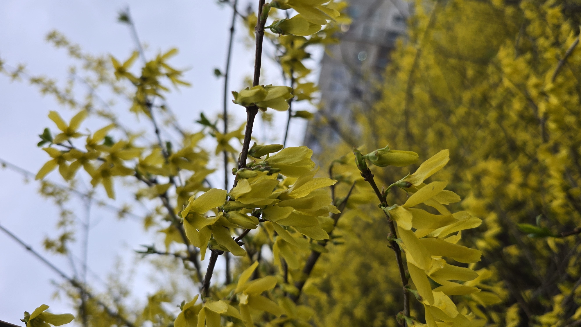 close-up of Forsythia flowers in bloom, likely in Pleven, Bulgaria, given the request. The flowers are bright yellow, and some branches show buds that haven't yet fully opened. The background is slightly blurred, with a building visible through the flowers. The sky is overcast.