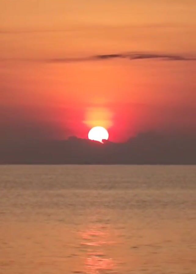 The video displays a serene ocean sunset, with a vibrant sun partially obscured by a layer of clouds