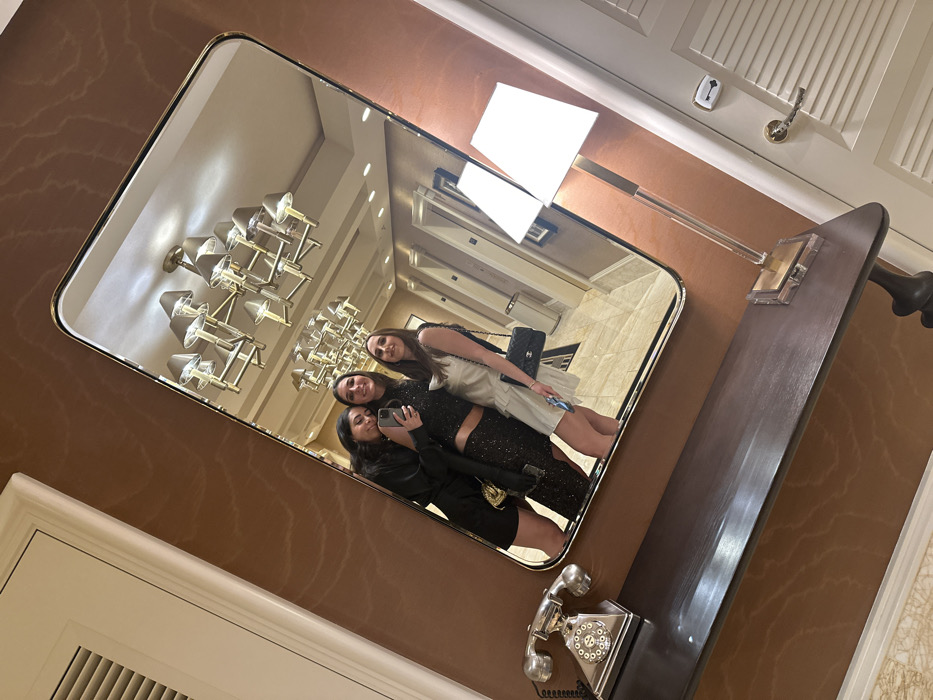 Three young women are reflected in a rectangular mirror with a gold frame. They are taking a selfie with a phone. The reflection reveals a hallway with chandeliers. To the right of the mirror is a dark wooden shelf with an antique telephone on it, and above that, a lamp. The wall is a textured brown. A door with white trim is visible in the lower left and upper right of the frame.
