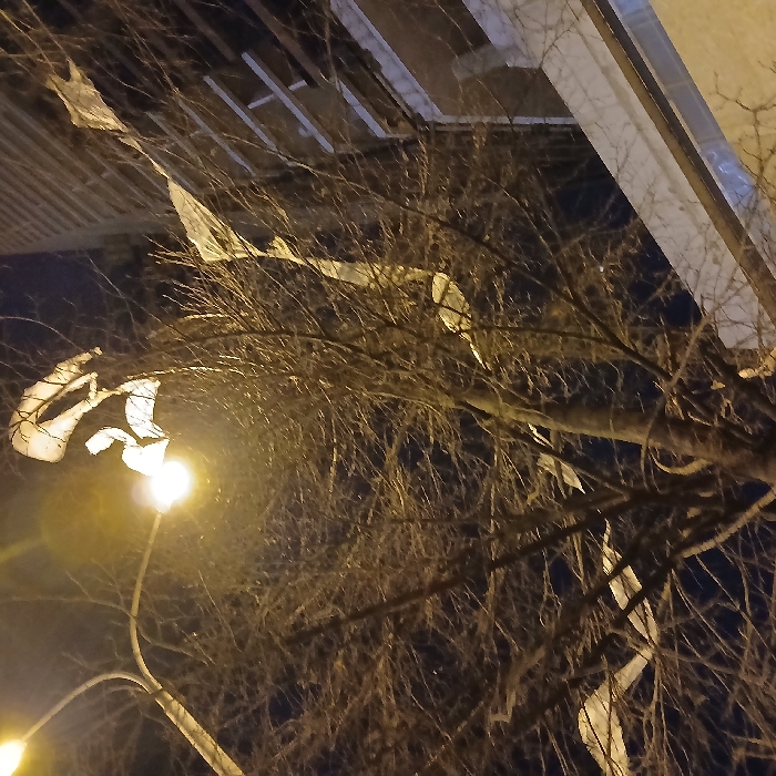 The image captures an urban nighttime scene in Yekaterinburg, Russia. A large, bare deciduous tree with intricate, leafless branches dominates the center and left of the frame, silhouetted against a dark sky. Entangled within the upper branches of this tree are multiple irregular pieces of light-colored, torn sheet material, consistent with fabric or plastic. One large piece hangs prominently near the top of the tree. A street light pole is visible on the upper-left, featuring a single, intensely glowing yellow-orange fixture that illuminates the immediate area and causes glare. To the right, a multi-story building rises vertically, with additional pieces of similar light-colored, torn material clinging to its facade, particularly along a lower architectural element or ledge. No individuals are present in the scene. Artificial light from the street lamp is the primary illumination source.