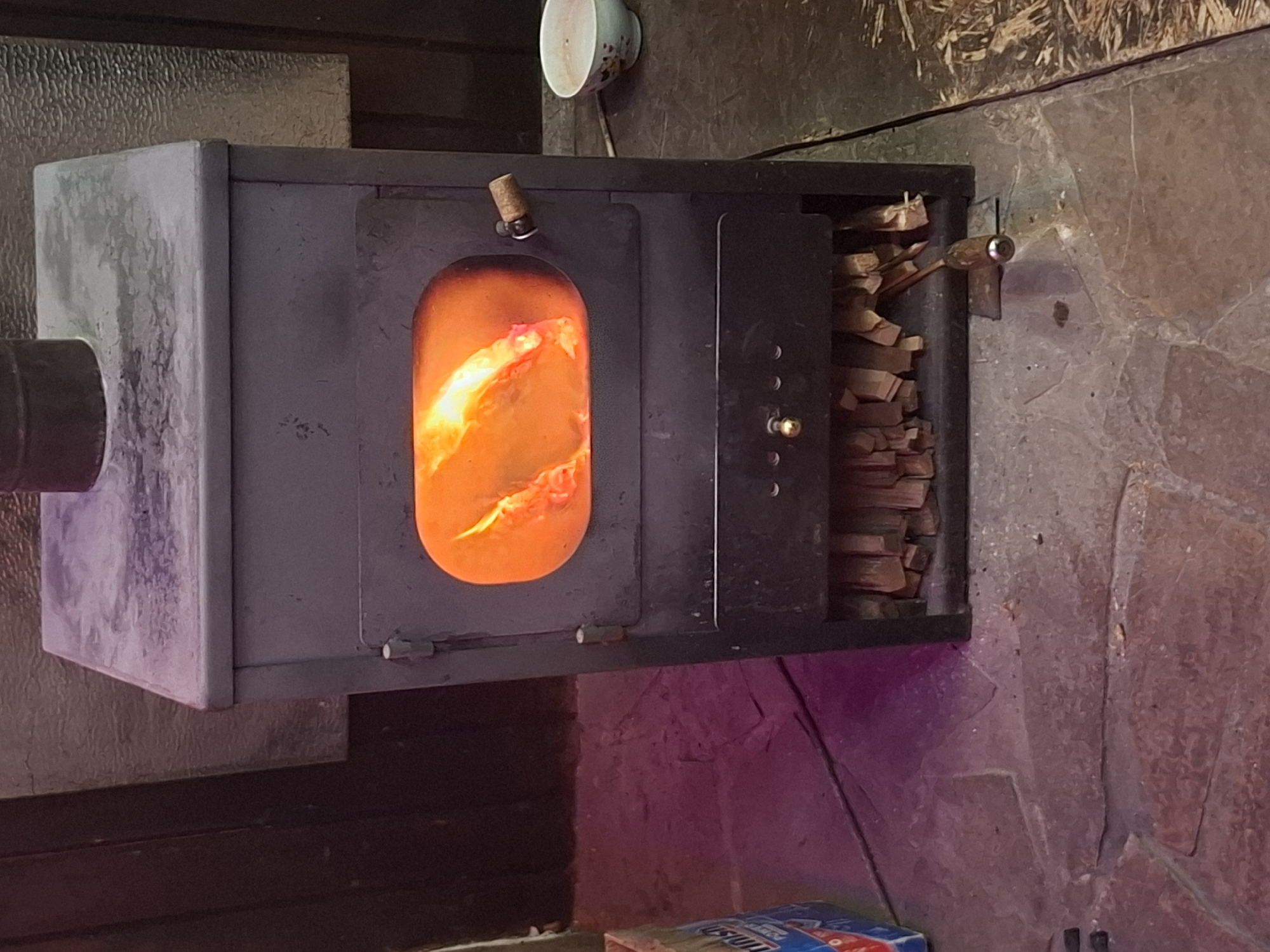 A dark-colored, rectangular wood-burning stove with an active fire is centrally positioned on a floor of irregular stone flagstones. The stove's upper front panel features an oval glass window, revealing bright orange and yellow flames. A wooden-handled latch is visible on the right side of this panel. Below, a smaller, dark metal panel displays a brass-colored knob. The lowest section of the stove forms an open compartment, neatly stacked with split firewood or kindling. A dark metal pipe extends vertically from the top surface of the stove. To the immediate left of the stove, a partially obscured blue and white box is visible on the flagstone floor, displaying the partial text "FINISH POWE". To the right of the stove, a small white ceramic bowl with a subtle floral pattern, containing minor residue, rests on the floor. A dark electrical cable or cord lies on the floor near the bowl. A metal tool, possibly an ash rake or poker, with a wooden handle, is positioned on the flagstones directly in front of the stove's firewood compartment. The background behind the stove is dark and indistinct, with a textured or rippled surface visible on the wall behind the upper left portion of the stove. The overall illumination is dim, with the stove's fire casting a warm glow, complemented by a faint purple or pinkish ambient light visible on the flagstones to the left. This scene is located in Nesebar, Bulgaria.