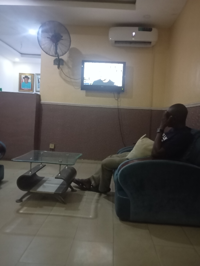 A man sits on a blue couch in a room with a glass-topped coffee table. He's wearing a dark shirt and light pants, with his feet extended. A fan and an air conditioner are mounted on the wall above a television that shows a grayscale image. The walls are painted with a two-tone design. In an adjacent room, two framed pictures are visible. The overall lighting is subdued.