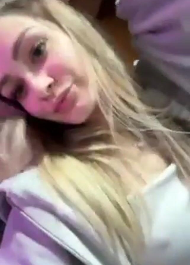 A young woman with long, light blonde hair is seen in an indoor setting. She wears a white top and a light-colored jacket. The lighting in the room has a purple hue. The woman is looking at the camera, and she runs her fingers through her hair.