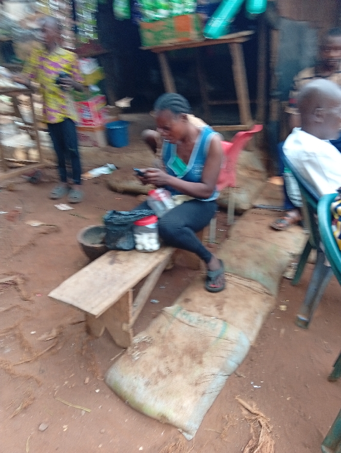 The image captures an outdoor scene in Ogidi, Nigeria, featuring a reddish-brown dirt ground. A female individual, positioned centrally, is seated on a red plastic chair, wearing a blue sleeveless top over a lighter garment and dark trousers. She is actively engaged with a black smartphone held in both hands. To her left, a small wooden bench supports a black plastic bag, a wooden bowl, and a clear plastic jar containing numerous small, white, oval-shaped objects. Two flattened, light-brown woven sacks are arranged on the ground beside the bench. In the left background, a person wearing a yellow and purple patterned shirt stands, seemingly holding a dark object. To the right, a portion of a man in a white shirt is visible, seated on a chair with a green frame. The background includes blurred wooden structures, various packaged goods, and a blue bucket, consistent with a market or roadside stall environment.