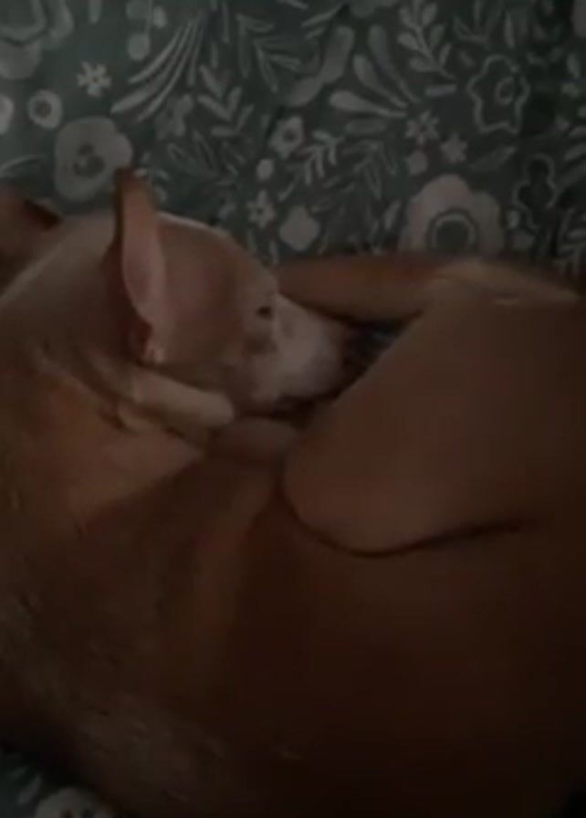 light brown dog curled up on a bed, its head nestled near its tail. The dog is lying on a bed covered with a teal and white floral pattern. The room appears to be dimly lit. The dog is mostly still, appearing to be asleep or resting.