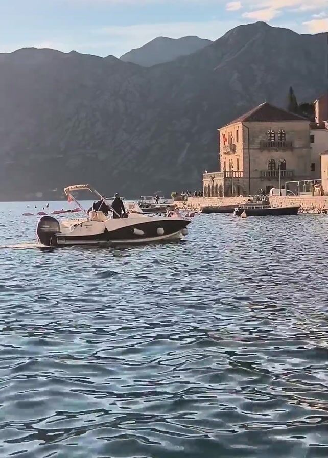 small black and white motorboat with two people on board moving across a body of water toward a shoreline. The shoreline has a stone building on it, and a walkway with people walking along it. Behind the building are large mountains. The water has gentle ripples. The sky is blue with some scattered clouds. The sun is shining.