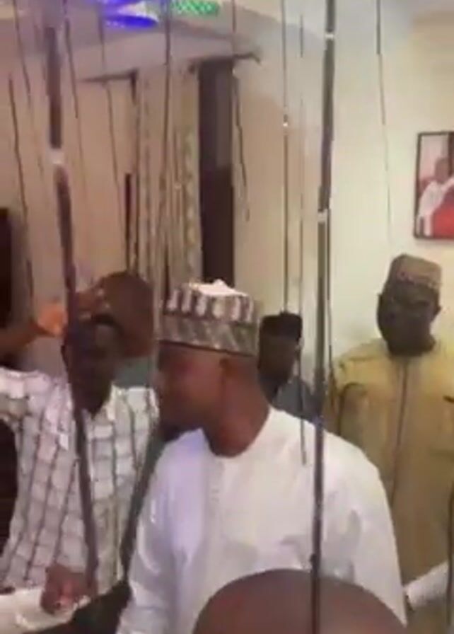 group of men in what appears to be a party or celebration. The men are dressed in a mix of traditional and casual clothing. Some of the men are wearing traditional Nigerian caps and gowns. There are black streamers hanging from the ceiling, and some colored lanterns. The men appear to be dancing, with their arms in the air. One man in the center wears a white gown and cap. Several men are holding up their hands displaying finger gestures. The atmosphere appears to be joyful.