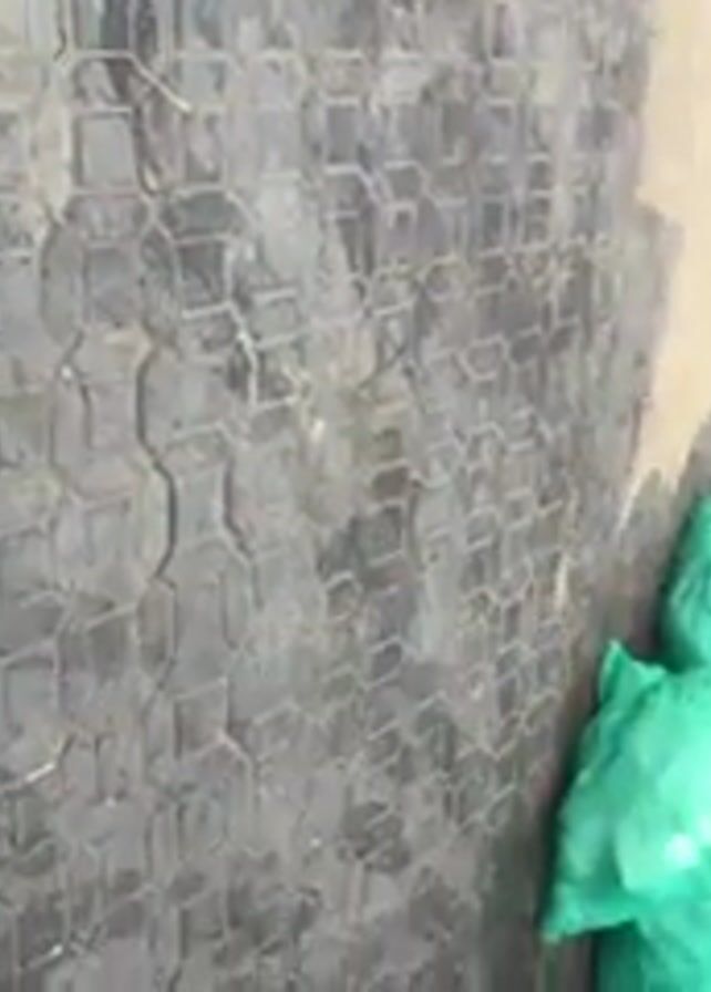 person standing on a stone-tiled sidewalk wearing blue shorts and flip-flops. They are positioned close to a pile of green bags, which appear to be the focus of the video as the camera shifts to show a person sorting through them. A dark blue car is parked nearby and a person wearing black attire is seen near a parked motorcycle in the background. The setting seems to be an urban street with shops visible across the street. The overall scene is taken during daylight hours.