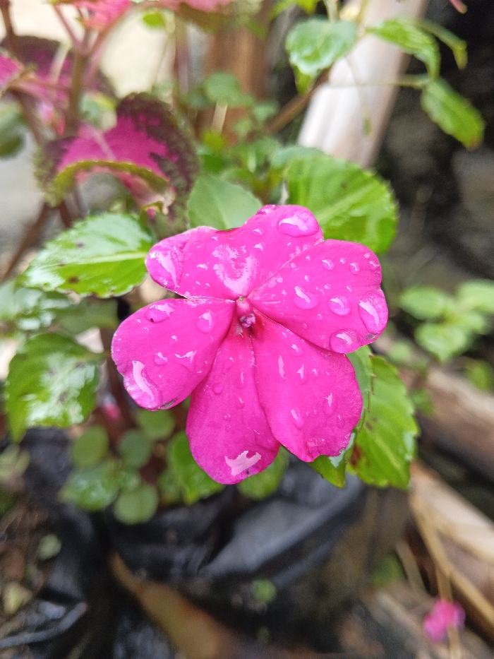A vibrant pink flower with five petals dominates the frame, adorned with sparkling water droplets. Lush green leaves surround it, some marked with dark spots. In the background, other foliage adds depth, including a leaf with reddish-purple accents. The flower is the primary focal point, contrasting with the darker tones of the soil or planting medium below. The overall impression is one of freshness and natural beauty.