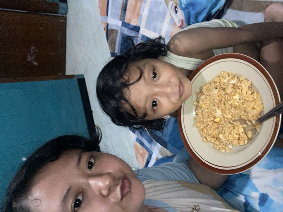 An indoor photograph, taken in Gelam, Indonesia, displays two individuals. On the left, a presumed adult female with dark hair and dark eyes is partially visible, facing the camera with puckered lips. She wears a light-colored, short-sleeved top and a gold-toned necklace. To her right, a young child with dark, curly hair and dark eyes looks directly at the camera with a neutral expression. The child wears a light-colored sleeveless top. A white plate with a brown rim, containing fried rice and a metal spoon, is positioned in front of the child. Both individuals are situated on a floor covered by a checkered blue, white, and brown blanket or mat. A blue blanket with a cartoon character print is visible on the far right. The background features a dark teal-colored wall section and a dark brown wooden door or door frame. The floor consists of light-colored tiles.
