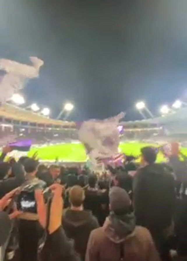 soccer crowd at a stadium at night. People are raising their arms and holding flags. One flag is white with a purple image of a man’s face. There are bright stadium lights. Many people are recording the event on their phones.