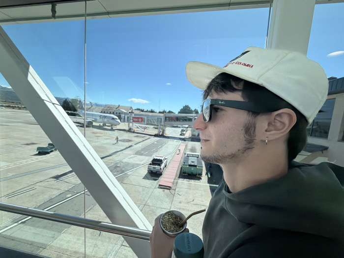 A person wearing sunglasses and a baseball cap that says "World Colombia" stands inside an airport terminal, holding a yerba mate